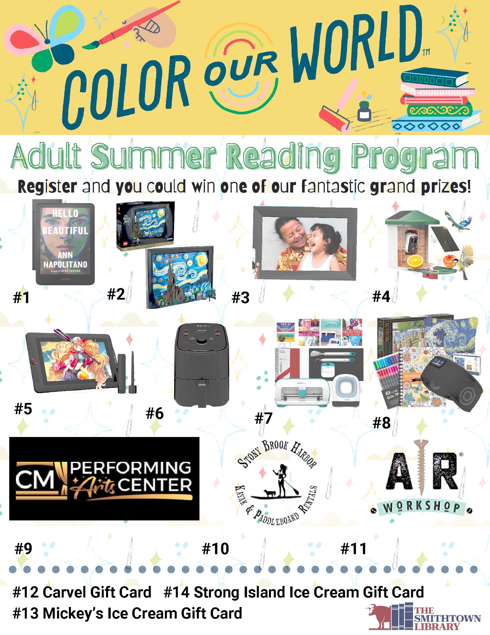 Summer Reading isn’t just for kids! You’ll earn chances to win great prizes by reading all summer long. The program starts on Monday, June 16 and continues through Saturday, August 23.