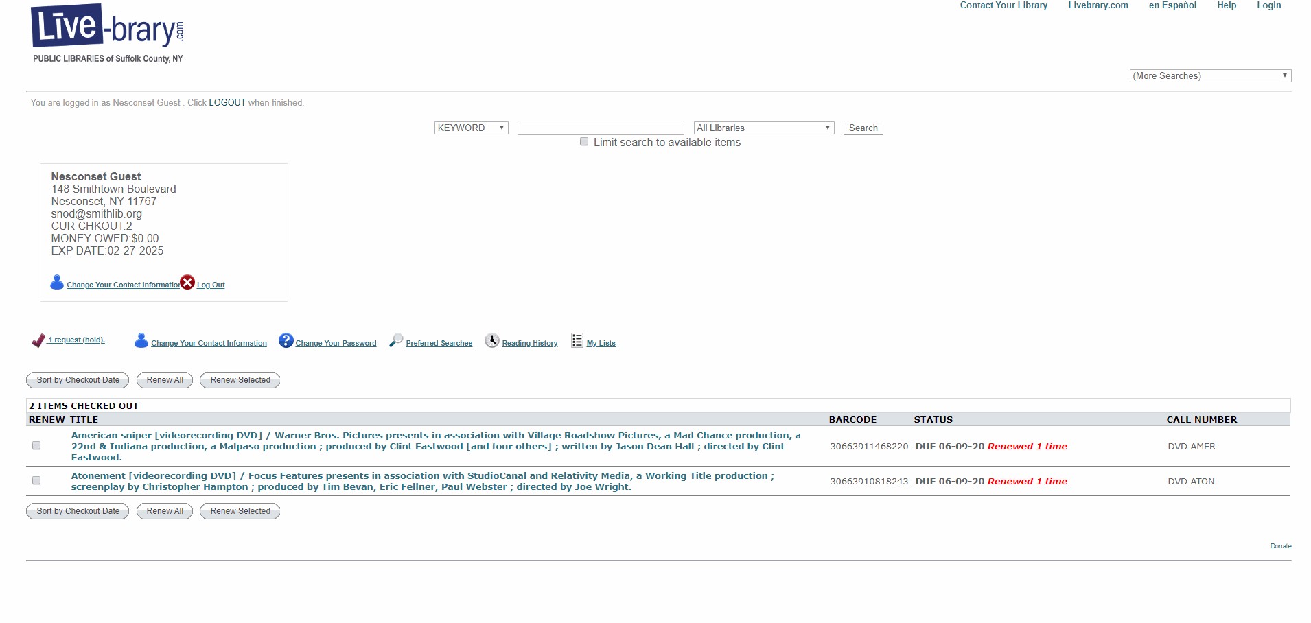 Any items currently checked out will appear on the screen and you can renew items if they are eligible. Above the items checked out, there will be a link to any items currently on request. To create a username, click on the link to Change Your Contact Information.